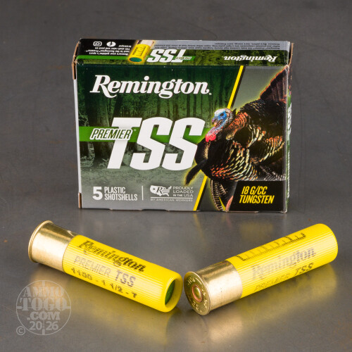 Lead is so last week. The real turkey hunting experts nowadays are embracing Tungsten Super Shot, which is made of tungsten alloy and more than 50% denser than outdated lead. And because TSS is completely nontoxic, it lets you hunt wherever lead has been outlawed!This Remington Premier TSS 20 Gauge shotshell is loaded with a 1-1/2 ounce serving of #7 TSS. Such hard pellets are incapable of deformation, and their superior density enables them to crush their target’s bones over incredibly long ranges. This shell’s #7 pellets would be too small for turkey if they were made of lead – but because they’re high-tech TSS, they perform more comparably to #4 or #3 lead shot!