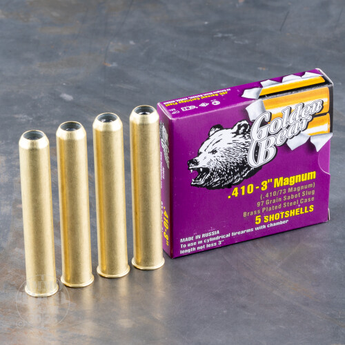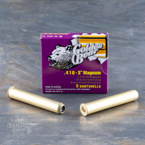 This is 410 gauge Golden Bear 3" 97gr. Sabot Slug Ammo. This ammo is manfactured in Russia by Barnaul. This ammo is berdan primed and has a brass plated steel case. It will work in all 410 shotguns with a 3" chamber. This ammo will work especially well in Saiga shotguns. It comes packed in 5rd. boxes.