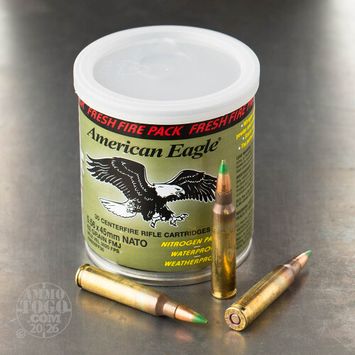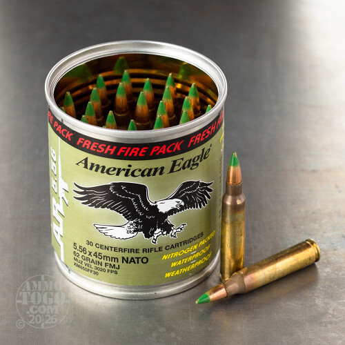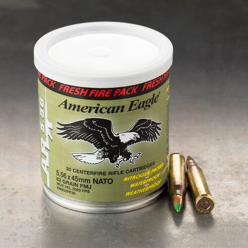 This Federal Fresh Fire pack contains 600 rounds of Lake City 5.56 NATO mil-spec ammunition in a nitrogen-sealed canister designed for long term storage. It's the perfect choice for stocking up on extra ammo for your AR-15 or other .223 Remington/5.56 rifle. These cartridges follow the M855 ball standard and fire a 62 grain full metal jacket bullet. Lake City ammo is loaded in Independence, Missouri using non-corrosive Boxer primers and reloadable brass cases with visible annealing marks.-