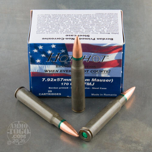 These Hotshot 7.92x57mm (8mm Mauser) cartridges are an affordable choice to get you out on the range. Each steel case in this 720 round bulk pack is loaded with a 170 grain FMJ projectile. These cases are Berdan primed, non-reloadable, and will attract a magnet. Hotshot cartridges are loaded in Romania to CIP specifications and are sealed around the primer and projectile to extend their shelf life.-