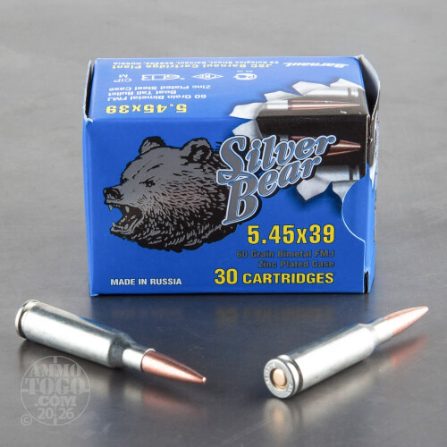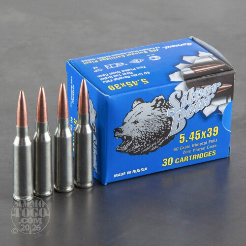 This is 5.45x39 Silver Bear 60gr. Full Metal Jacket Ammo. This ammo is manufactured by JSC Barnaul Machine-Tool Plant in Russia. The Barnaul plant is considered the premier ammunition plant in Russia, and they supply the majority of the ammo to the Russian military. This ammo is 100% non-corrosive, steel cased, and new factory ammo. It has a zinc plated steel case. This ammo is packed in 30rd. boxes, 750rds. per case.