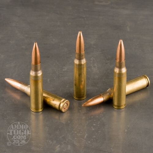 Loaded with boxer primers in new production brass, each casing has been through a military spec annealing process to strengthen the brass. Because these are military rounds, they retain a dark residue at the case neck left as visual evidence of the annealing process.