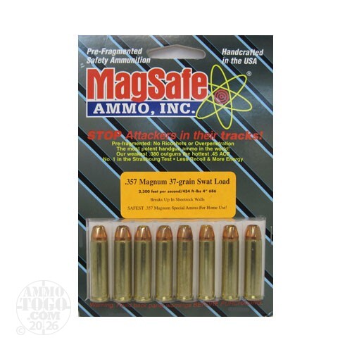 This is .357 Mag. Magsafe 68gr. SWAT ammo. Magsafe ammo offers magnum performance with increased safety. Magsafe’s revolutionary design uses large lead shotgun pellets rather than solid lead for a bullet’s core. Magsafe stacks the pellets in specific patterns for each load and uses a proprietary epoxy so that the bullet can be launched at maximum velocity and to allow the pellets to be easily broken apart upon impact. This allows Magsafe’s Controlled-Core Technology to provide perfect penetration combined with a minimum of ricochets. Despite Magsafe’s hot loads, recoil is much less than that of standard ammunition. Magsafe ammo is used by the elite of the world’s forces – Navy SEALS, Royal Hong Kong Police anti-gang units, from big-city undercover narcs to guards at some of America’s meanest prisons. Magsafe is expensive but it works – the question is this: just how much is your life worth? This ammo comes in 8rd packs.