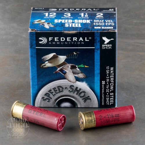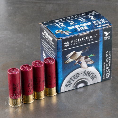 This 12 Gauge shotshell from Federal’s Speed-Shok line of ammunition is loaded with 1 1/8 ounces of #2 steel shot. The exceptionally round pellets establish a tight pattern upon exiting the muzzle, and that they’re sped along down the bore by Federal’s high density plastic wad with a gas sealing flange does even more to promote a consistent, accurate pattern.This shell is loaded with even burning propellant that dependably delivers a fast 1,550 fps muzzle velocity. That will let you enjoy an environmentally load without sacrificing your downrange performance. The Speed-Shok also features Federal’s Catalyst primer, which endures cold and wet weather remarkably well so that it can always guarantee you your shot. The Catalyst does a great job of burning its modern propellant quickly, another factor that contributes to its superior takedown performance. It all burns clean to keep your duck gun in better shape longer, too.