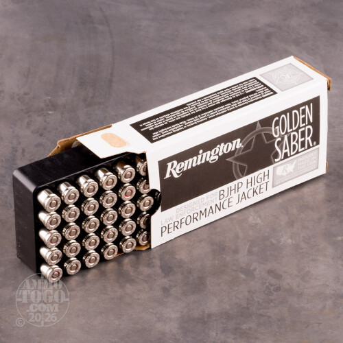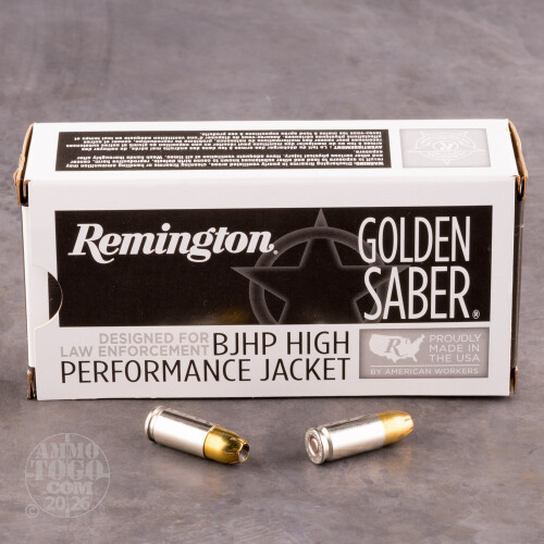 Remington's 147-grain 9x19mm Golden Saber rounds are up to the task for home defense, uniformed patrol, and concealed carry. Each cartridge utilizes a reloadable brass casing that has been plated with nickel and equipped with a clean-sparking Boxer primer. The nickel material resists moisture and subsequent corrosion while increasing reliability by reducing friction during feeding and extraction. The hard brass jacket resists deformation for increased accuracy in-flight and punches through light barriers with less deflection.Golden Sabers have wide mouths and spiral-cut serrations which ensure wide, dependable expansion even at lower velocities. The heavy, 147-grain weight lends itself to smoother, stouter cycling and yields greater terminal energy at the end of its journey. During entry into a target, the bullet's increase in diameter will create a larger wound channel while delivering optimal energy to deeper zones in order to end a threat. Remington is an American company with over two centuries of experience during which they have developed a reputation for great firearms, consistent ammunition, and timeless calibers that are in use worldwide.