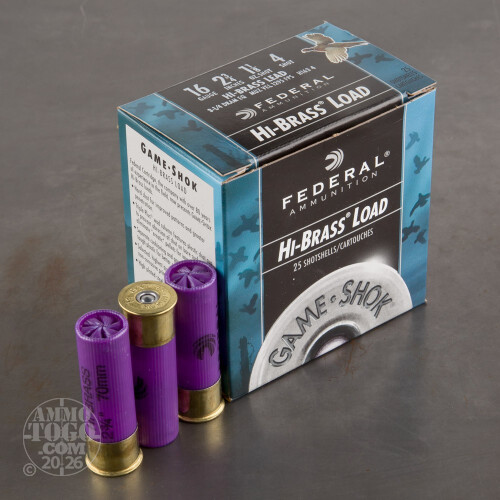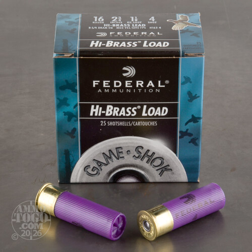 This is 16 Gauge Federal Game-Shok High Brass 2 3/4" 1 1/8oz. #4 Shot Ammo. This is a quality upland game shotshell at an affordable price. This hi-brass load has a muzzle velocity of 1295fps. and provides superior performance on your favorite small game. Comes packed in 25rds. per box.