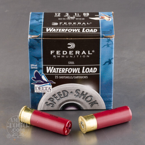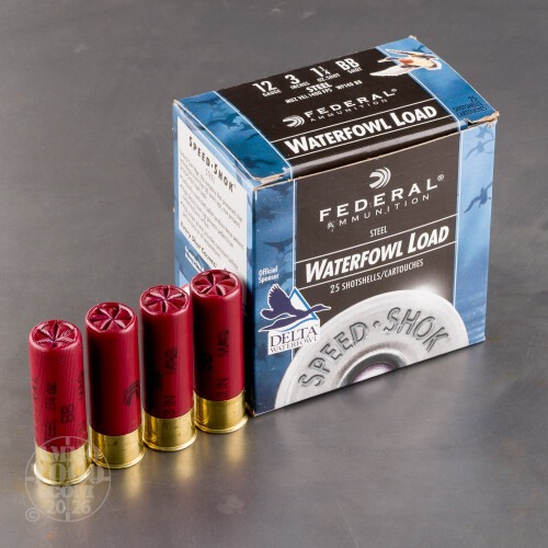 This is 12 Gauge Federal Speed-Shok 3" 1 1/4oz. #BB Steel Shot Ammo. Federal Speed-Shok is built for performance at a value price and it features uniformly round pellets for tighter shot patterns. Federal Speed-Shok also features a high density plastic wad with a gas-sealing flange for efficiency. Additionally, their high output primers ensure consistent ballistics and solid dependability even in cold and wet conditions. This ammo comes packed 25rd. boxes.