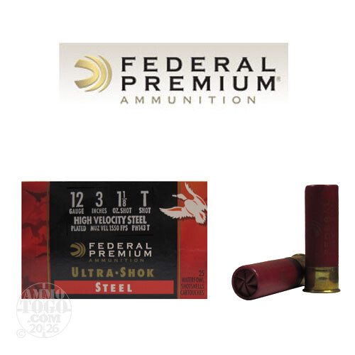 25rds - 12 Ga. Federal Ultra-Shok 3" 1 1/8oz. #T HV Steel Shot Details