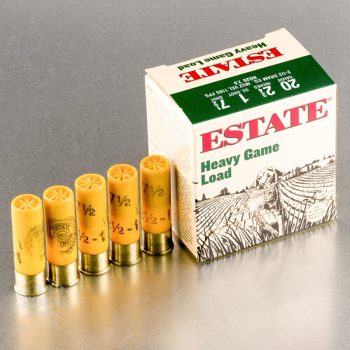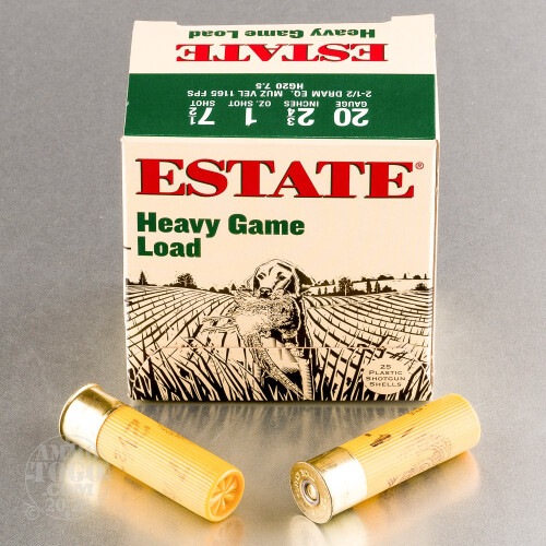 This is 20 Gauge Estate 2 3/4" 1oz. #7 1/2 Shot Heavy Game Load Ammo. These Heavy Game loads may be used for a variety of applications both in the field or at the range. This Estate round is ideally suited for Rabbit, Squirrel, Dove, Quail, Partridge, Pheasant and Chukar hunting. Muzzle velocity of 1165fps. This ammo comes packed in 25rd boxes, 250rds per case.