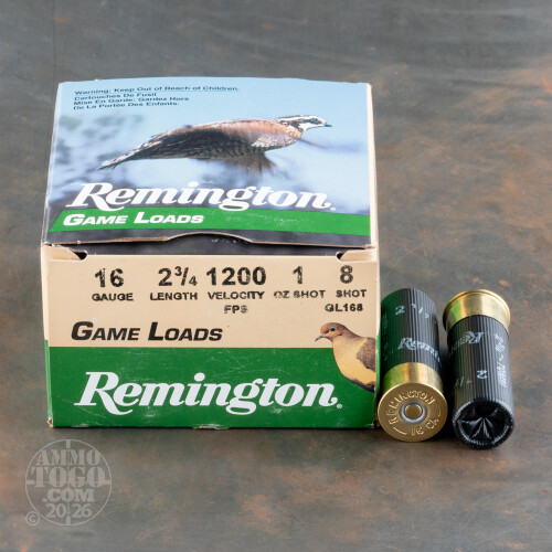 This is 16 Gauge Remington Game Load 2 3/4" 1oz. #8 Shot Ammo. Remington lead Game Loads offer budget-streching shotshells for a wide variety of small game hunting. This hi brass shotshell has a muzzle velocity of 1200fps. and comes packed in 25rds. per box and 250rds. per case.