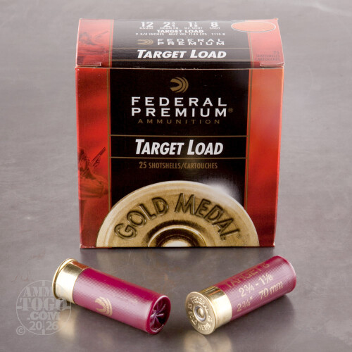 This is 12 Gauge Federal Gold Medal Target Load 2 3/4" 1 1/8oz. 2 3/4 Dram # 8 Shot Ammo. Shooters choose Federal Gold Medal when the top prize is on the line. Consistent and uniform patterns, along with extra-hard shot and the hot 209A primer, have made this product a must-have on the target shooting circuit. This is a top quality target load at an affordable price. This ammo has a mussle velocity of 1145 fps and comes packed in 25rds. per box, and 250rds. per case.