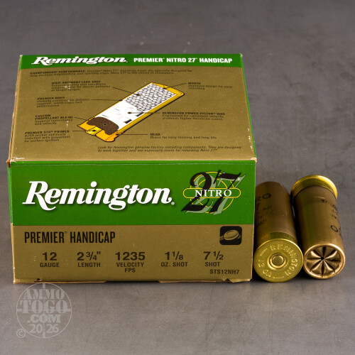 This is 12 Gauge Remington Premier Handicap Target Load 2 3/4" 1 1/8oz. #7 1/2 Shot Ammo. Remington's Target Loads have excellent shot-to-shot consistency, setting the standard at all major skeet, trap, and sporting clay events. These shotshells also provide handloaders with unmatched reloading ease and hull longevity. Packed 25rds. per box.